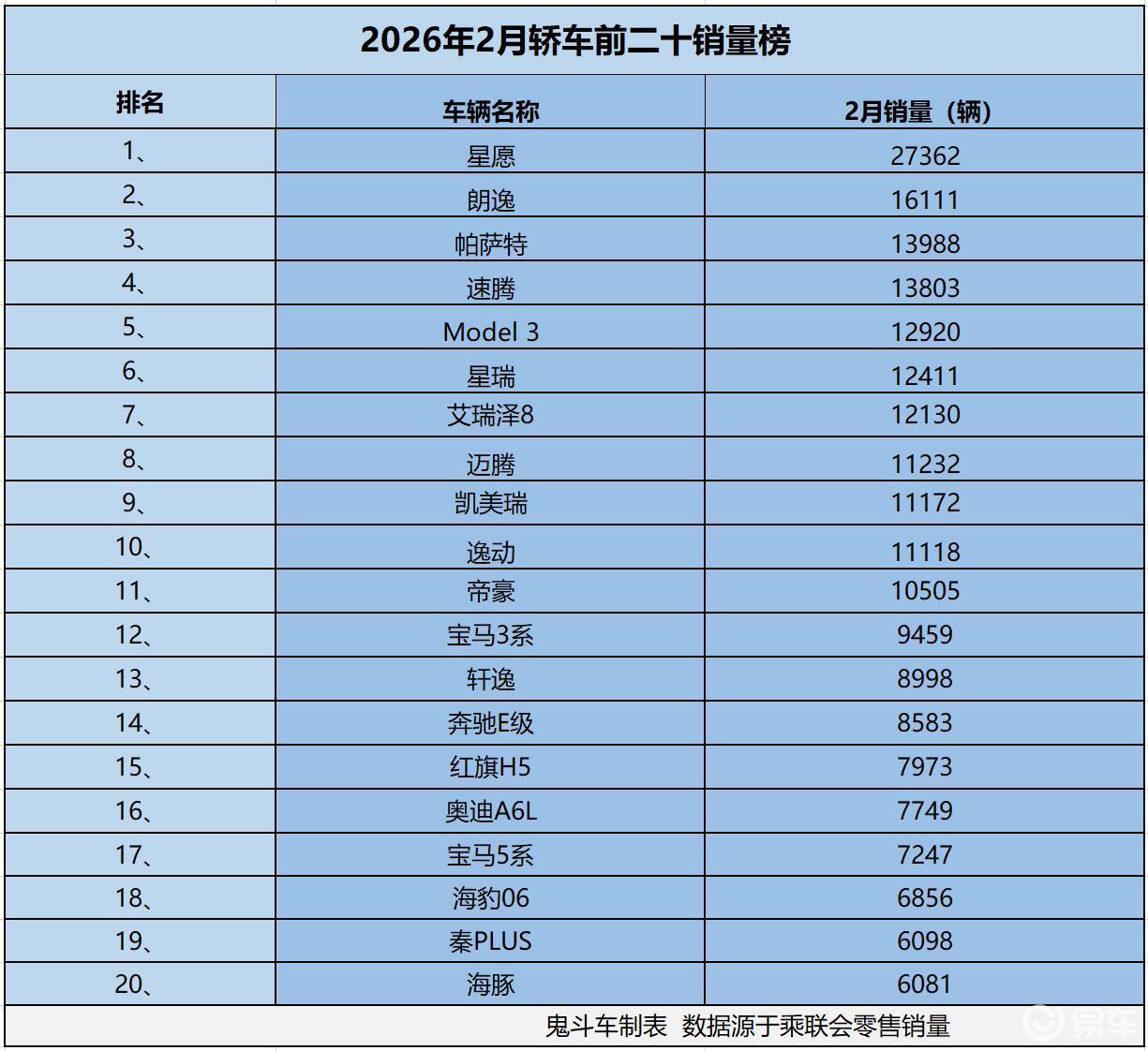 由于春节假期与消费节奏的影响,2月轿车市场降温了。销量就是最好的证明,从乘联会零售销量数据看到,2月份,只有11款轿车销量过万,跟以往的销量表现相比,差距显而易见。接下来,看看2月轿车市场销量排名前二十榜单,看看哪些车型榜上有名?谁的销量表现更出众?